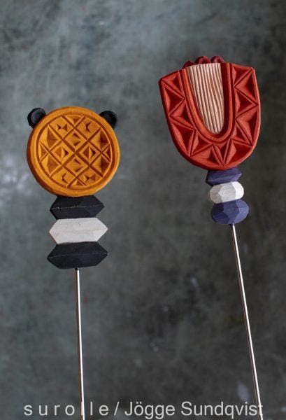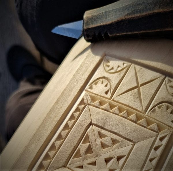 The cut should of course be clean and neat, but at the same time not be too fussy and stiff. I strive for an agile drive that has the knife running confidently in the wood fibres without anxiety. Of course the pattern should marry the object and speak the same language. And the cut should also skew a little charmingly, sparkle and crackle. It's hard to put my finger on how this happens, it's wonderful when it just happens, but I usually have to work on the ideas several times, preferably with time in between, before I'm satisfied.