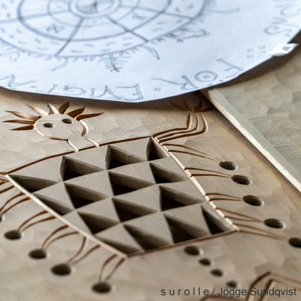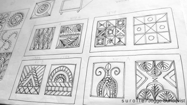 Sometimes I am asked if the pattern is made at the same time as the slöjd item. It happens during clear moments of pure inspiration, but it is rare. Often I have no idea. Then I usually sit and idle on the surface until something appears. Like the object is signalling what's appropriate. But if we're not ‘connected’, if it's completely dead, then I browse through my pile of sketchbooks for inspiration. If I don't find anything there, I use my image bank. There are pictures from museum archives and local outdoor museums that I have visited over the years. With a bit of luck, something clicks and an old pattern falls into a new context and becomes new again after some processing. When it gets a surolle touch, a manner or a look if you will, I start to feel confident.