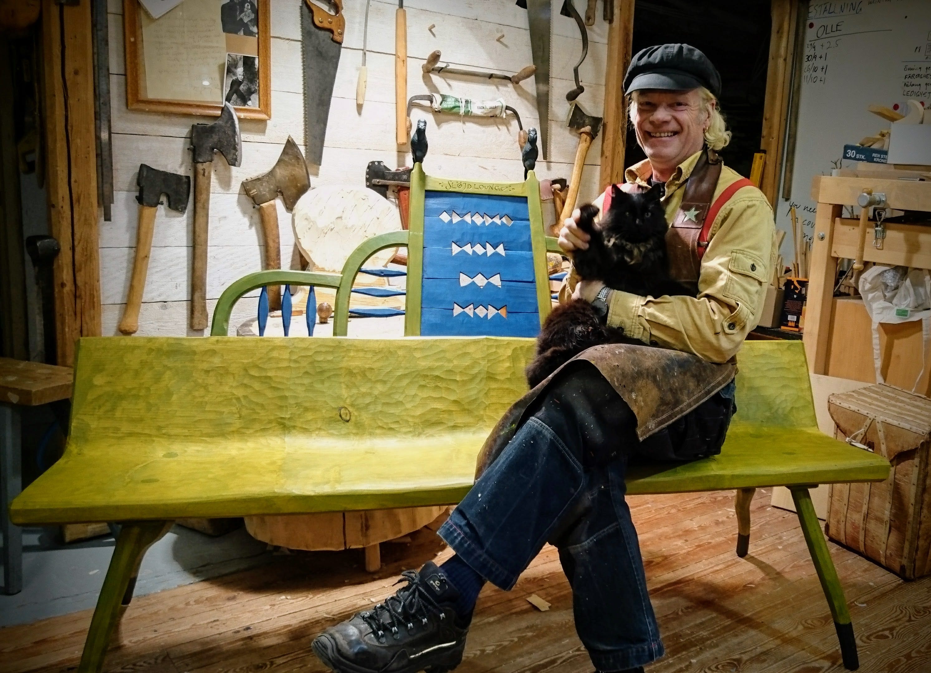 Is it a bench with a backrest or is it a sofa? It’s hard to say, so I decided to call it the Slöjdlounge. The seat and part of the protruding backrest are made of homogeneous spruce. The material was actually much larger. I got it from my father in Högland. They had felled a huge spruce tree nearby, and the neighbour had used his backhoe to transport it to Willes’ place. I think the material was a little too big for him to handle; he was in his 80s at the time, so when he asked if I wanted it, I didn’t hesitate to say yes. I had a public commission project for Sunne municipality in the works and wanted to make an outdoor bench. Spruce is relatively rot-resistant, which made it a good choice. In addition, the lower part was largely free of knots. That would definitely make it easier to cut it smoothly, or “clean cut” as I call it.