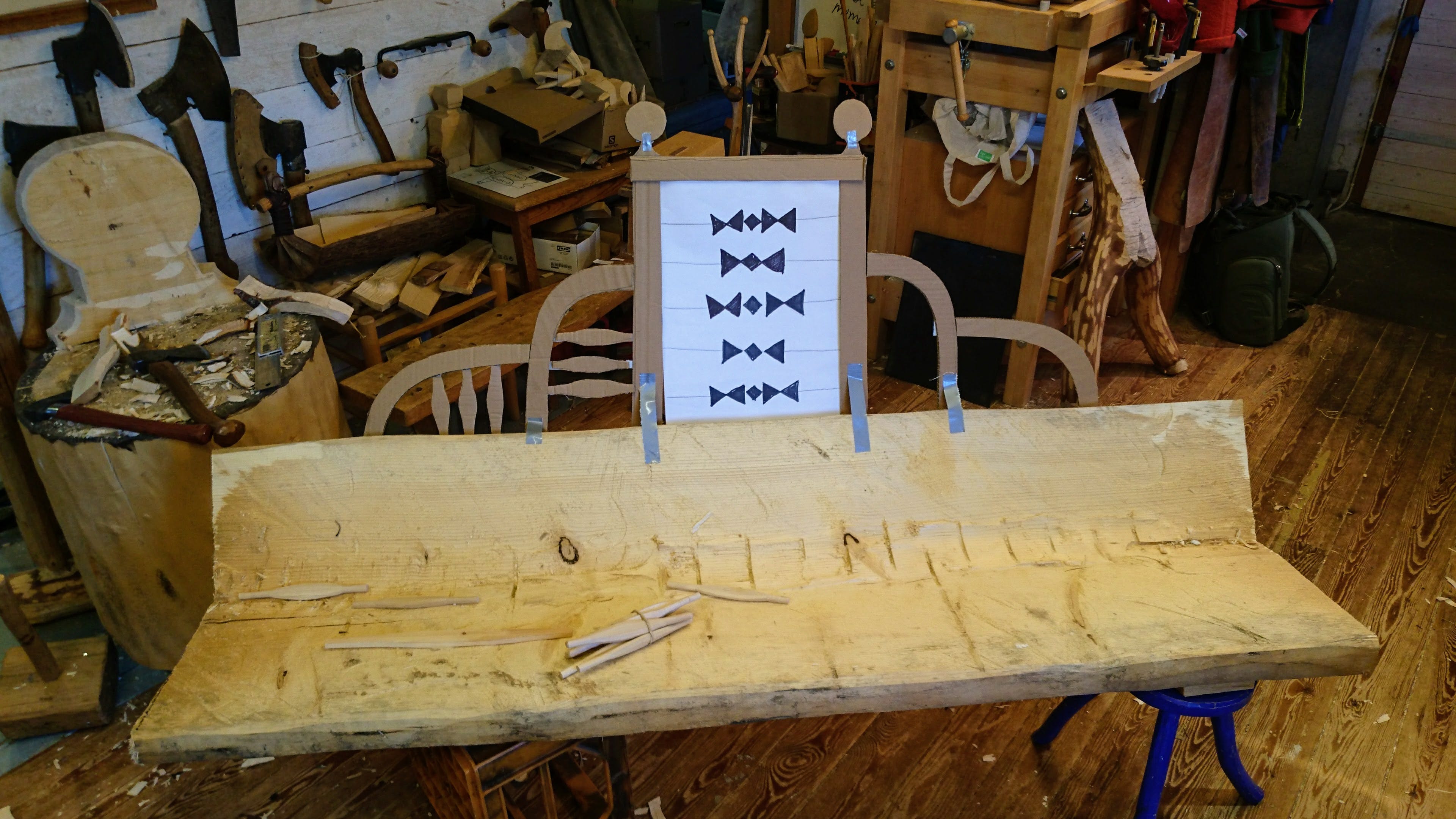 Some of you may be familiar with my signature style and my great love of working with crooked wood. In this sketch, I was able to express the strength and beauty of the crooked. I have collected some material over the years, a few hundred barked dry hooks lie in the shed, sorted into different categories, and they are calling out to me! Once I had found four subjects, I had to fine-tune the sketch a little, then make templates to test on a 1:1 scale, adjust a little more, and then slöjd it.
